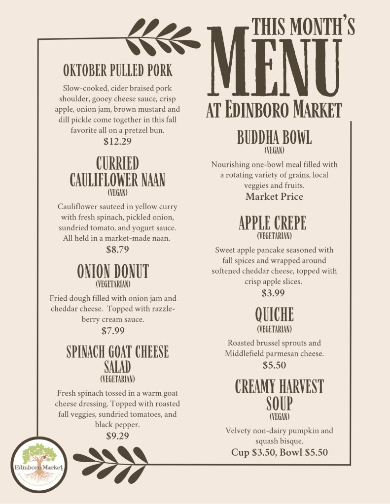 Call us at (814) 266-2993 | Email us at edinboromarket@gmail.com | Visit us at 211 Mill Street, Edinboro, PA 16412