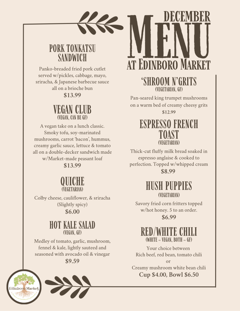 Call us at (814) 266-2993 | Email us at edinboromarket@gmail.com | Visit us at 211 Mill Street, Edinboro, PA 16412